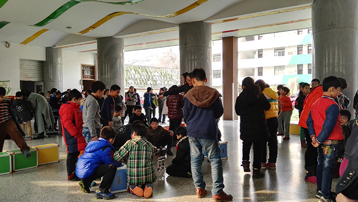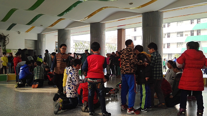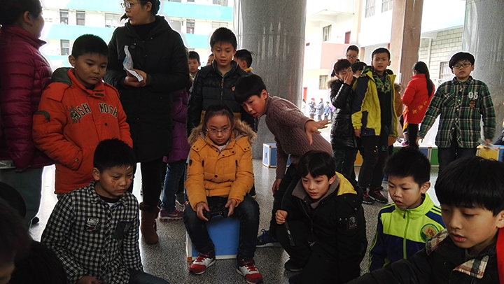 現(xiàn)場的秩序已經(jīng)抵不住孩子們的洪荒之力了,瞬間比賽現(xiàn)場由剛開始的井然有序變成現(xiàn)在的圍坐一圈,看著孩子們興奮的樣子,不忍心破壞他們想近距離觀戰(zhàn)的心情,就這樣由著他們開心的嗨皮吧。